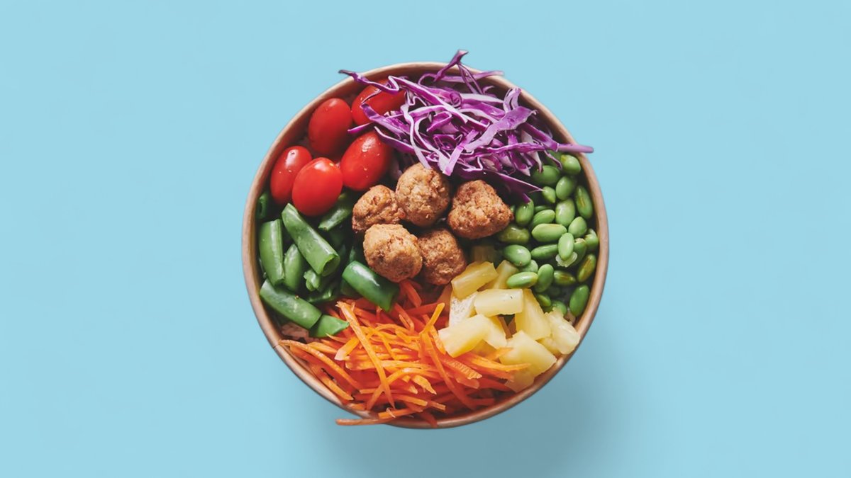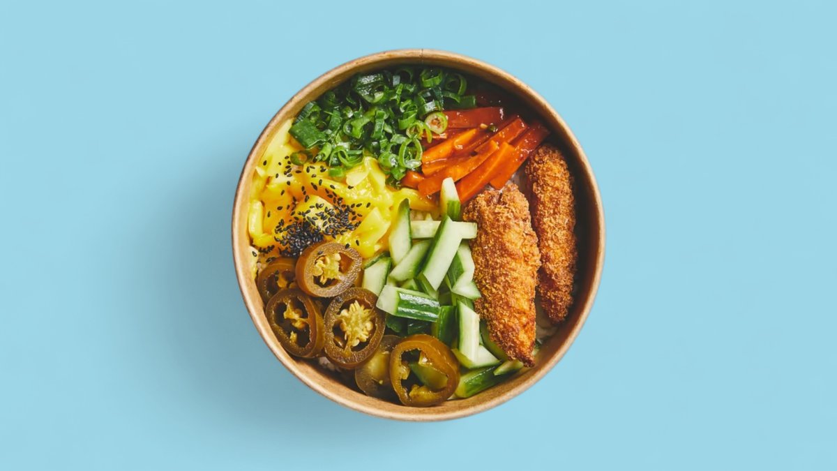 Ris serveret med kikærter, kyllinge tenders, salat(kan være icebergsalat, rucola eller salatmix) , agurk, avocado, edamamebønner, revet gulerødder og majs. Toppet med sursødsauce, gomadressing, chilimayo, sesam og cashewnødder.