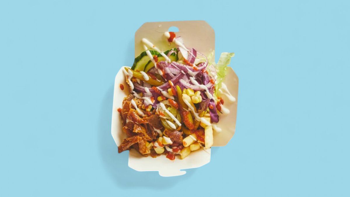 Ris serveret med kikærter, kalve kebab, salat(kan være icebergsalat, rucola eller salatmix), agurk, avocado, edamammebønner, revet gulerødder og majs. Toppet med sursødsauce, gomadressing, chilimayonnaise, sesam og cashewnødder.