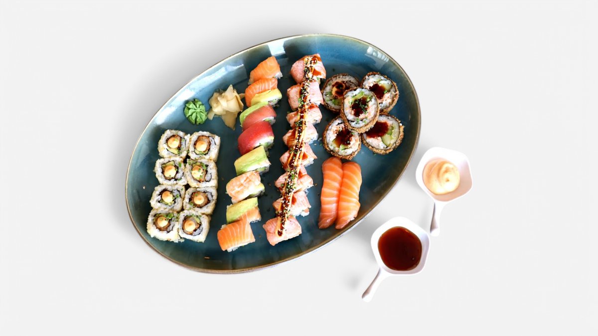 Forret: Edamane bønner • Tangsalat Nigiri: 4 laks • 4 rejer • 4 flamme grillet laks • 4 tun • 4 laks med avocado Uramaiki: 8 Alaska • 8 Crispy Ebi • 8 Shake Aioli Roll Uramaki med top: 8 Rainbow roll • 8 Huset roll • 8 Tun deluxe Futomaki: 5 California Big • 5Laks Big Tilbehør: Wasabi, ingefær, soja, chillimayo, rejechips, Teriyaki sovs og spisepinde