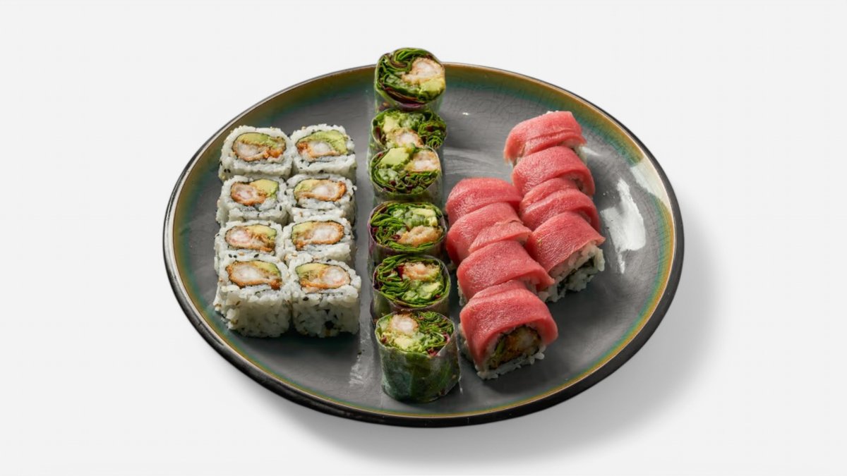 Nigiri: 3 x Laks 2 x Tun 2 x Laks avocado 2 x Reje Uramaki: 8 x Laks Roll 8 x Crispy ebi Roll Futomaki: 5 x Ebi Tempura Big 5 x California big Kaburimaki: 8 x Railbow Roll 8 x Sparking laks