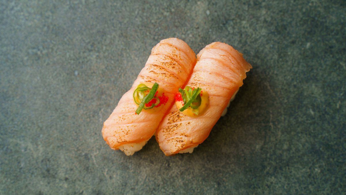 Lynstegt laks, chilimayo, rød masago og forårsløg.