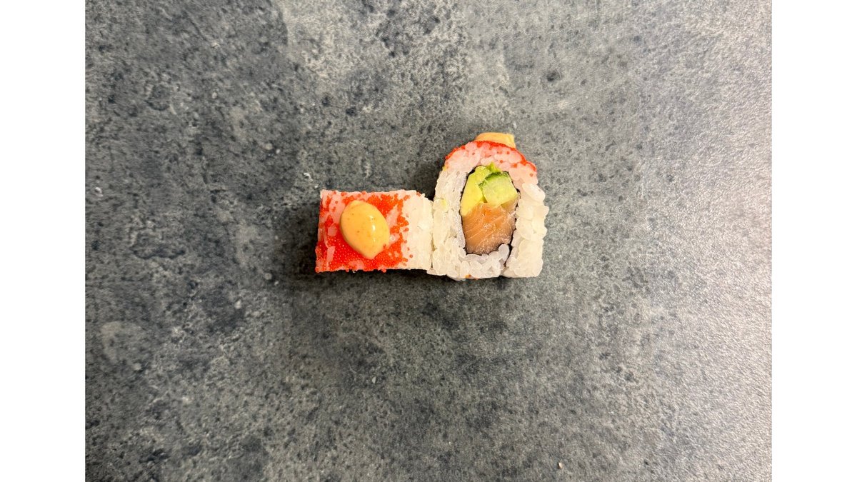 Surimi, avocado og agurk, toppet med lynstegt laks, rød masago, forårsløg, unagisauce og mayo.
