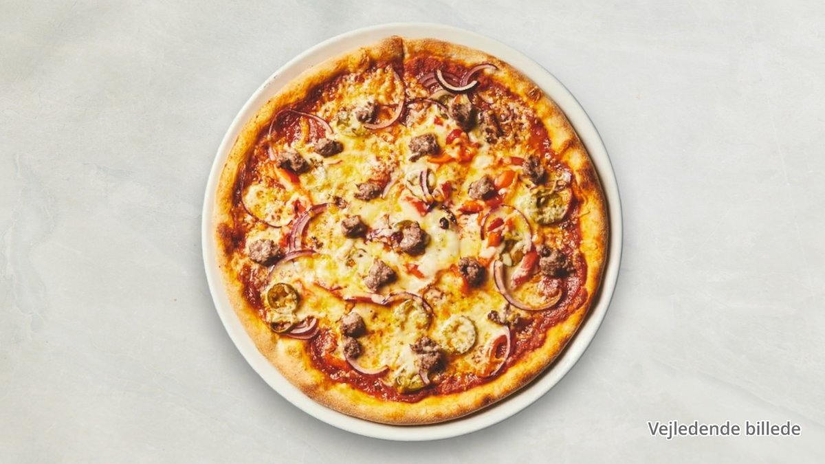 Tomatsauce, ost, kødstrimler, champignon, løg, paprika og jalapeños.