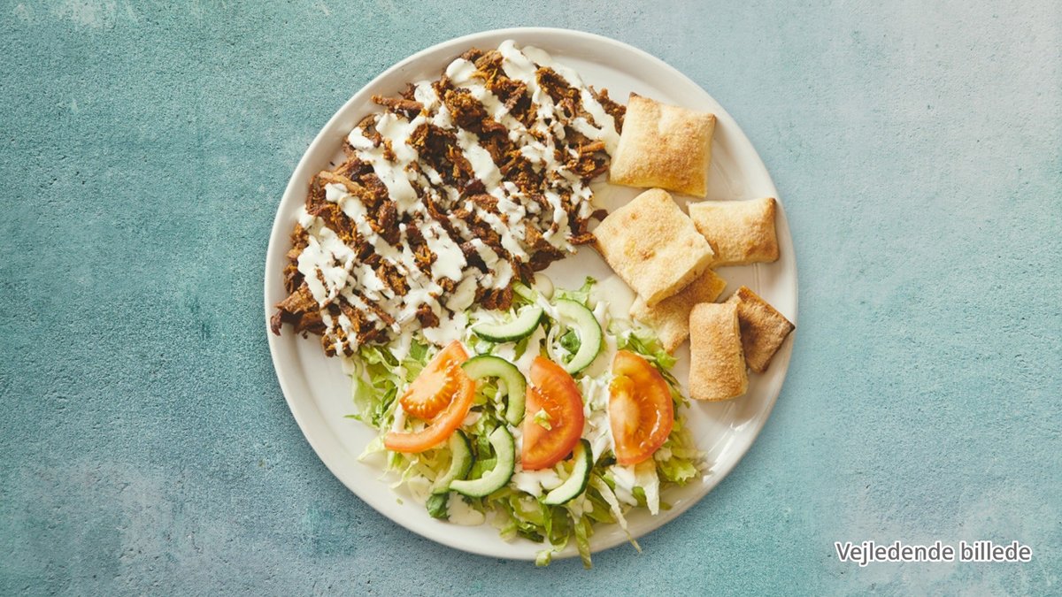 Hjemmelavet pitabrød med fyld af valgfri protein, salat, tomat, agurk og valgfri dressing.