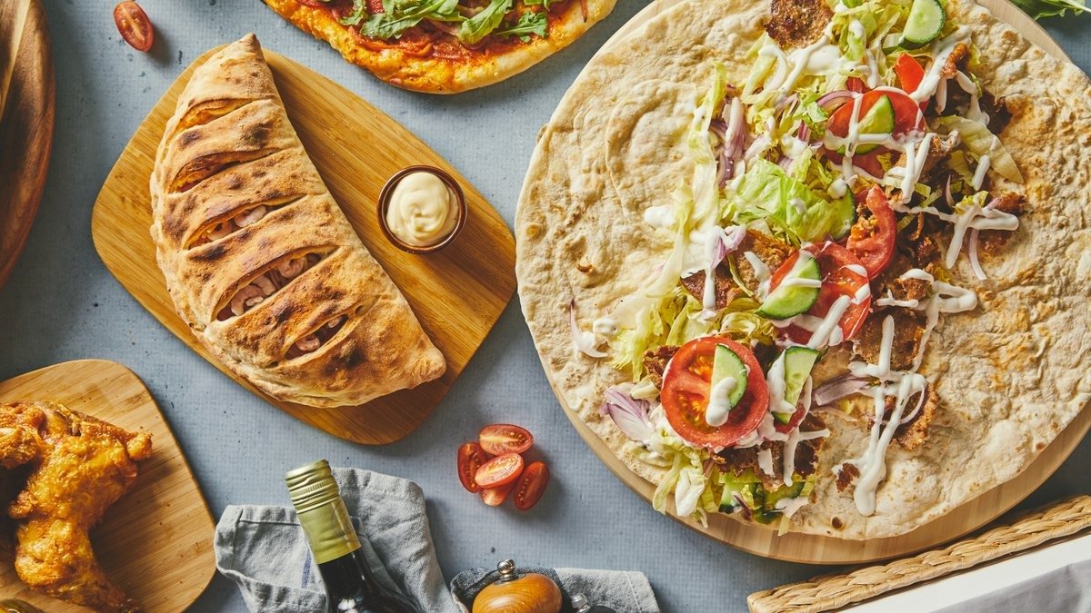 Tomatsauce, ost, valgfri protein, salat, agurk og valgfri dressing.