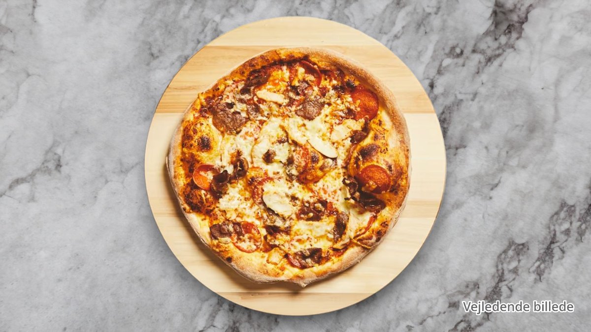 Tomatsauce, mozzarellaost, bacon, marineret kødstrimler, og hakket oksekød.
