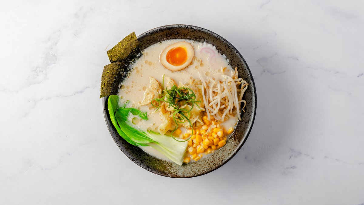 Ramen med tonkotsu suppe. Toppet med kylling wonton og sæsonens grøntsager.