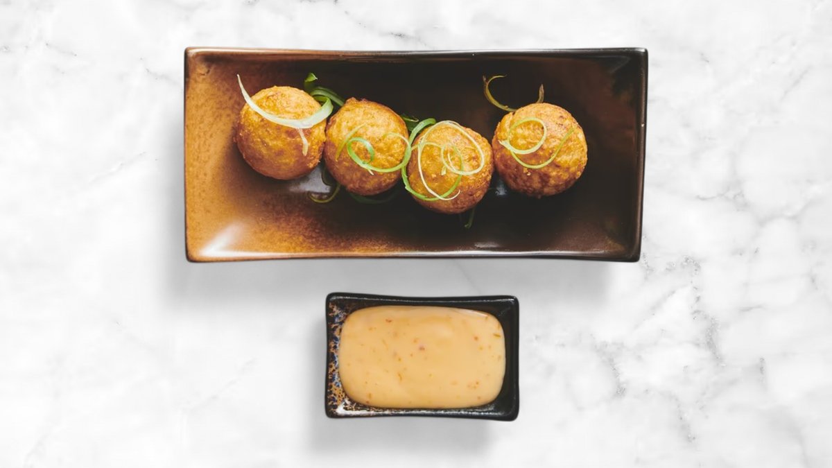 Serveres med sød chilisauce.