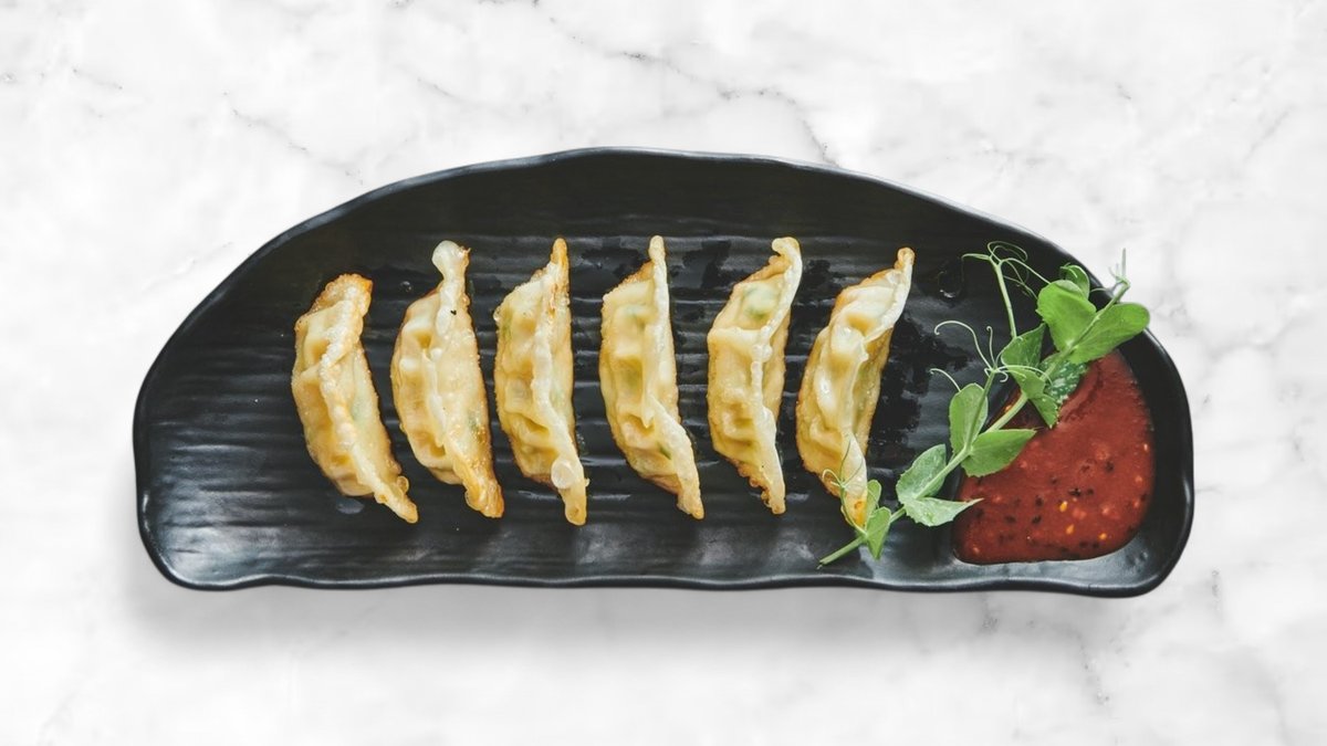 Pandestegte gyoza med kylling, serveret med kimchi sauce.