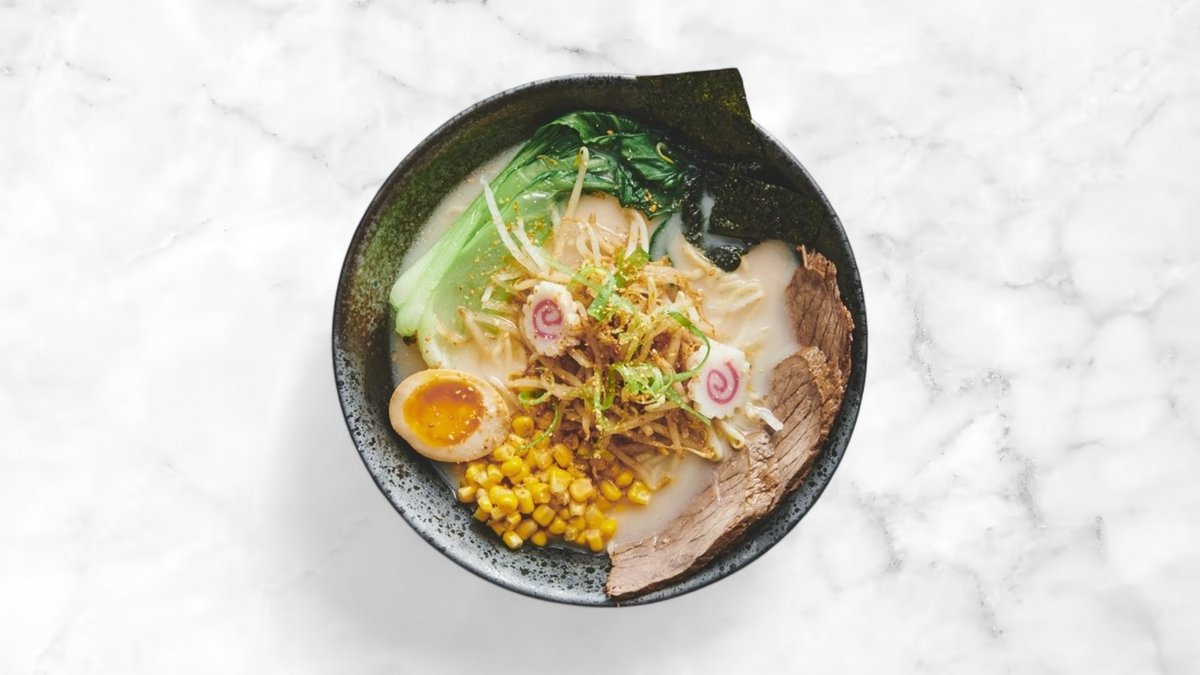 Ramen med tonkotsu suppe. Toppet med marinerede oksekødsskiver og sæsonens grøntsager.