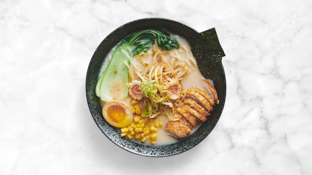 Ramen med tonkotsu suppe. Toppet med andesteg og sæsonens grøntsager.