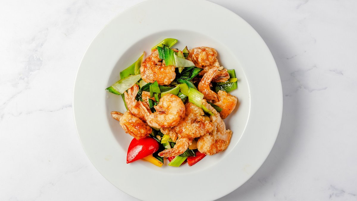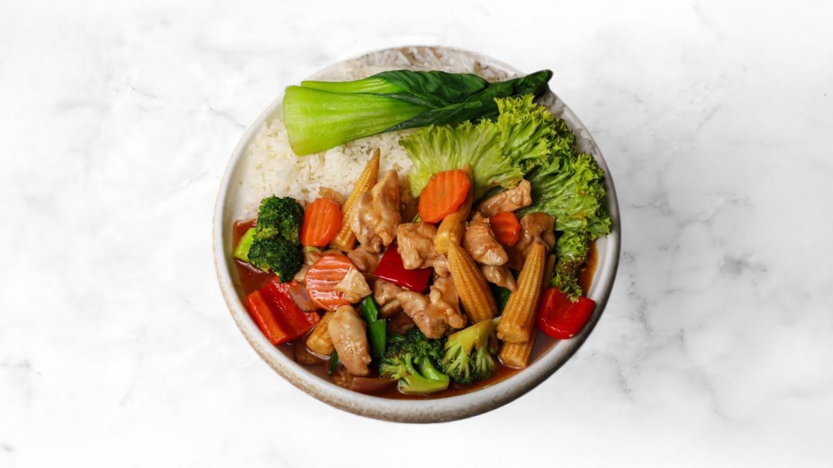 Sprøde kyllingestykker stegt med friske grønsager i en krydret, aromatisk spicy sauce.