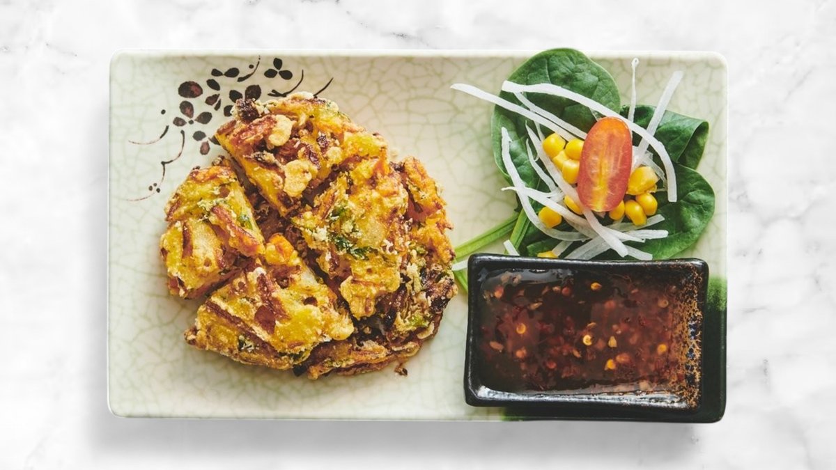 Serveres med æg, løg, bønnespirer og spidskål.