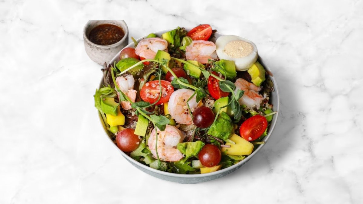 Rejer, salatmix, tomater, agurk, avocado, quinoa, mango, æg og hjemmelavet vinaigrette.