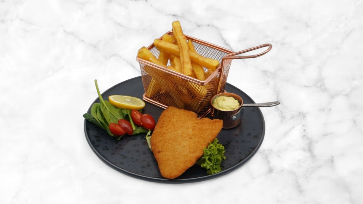 2 stk Tempura paneret Alaska-sejfilet, serveret med pommes frites og remoulade.