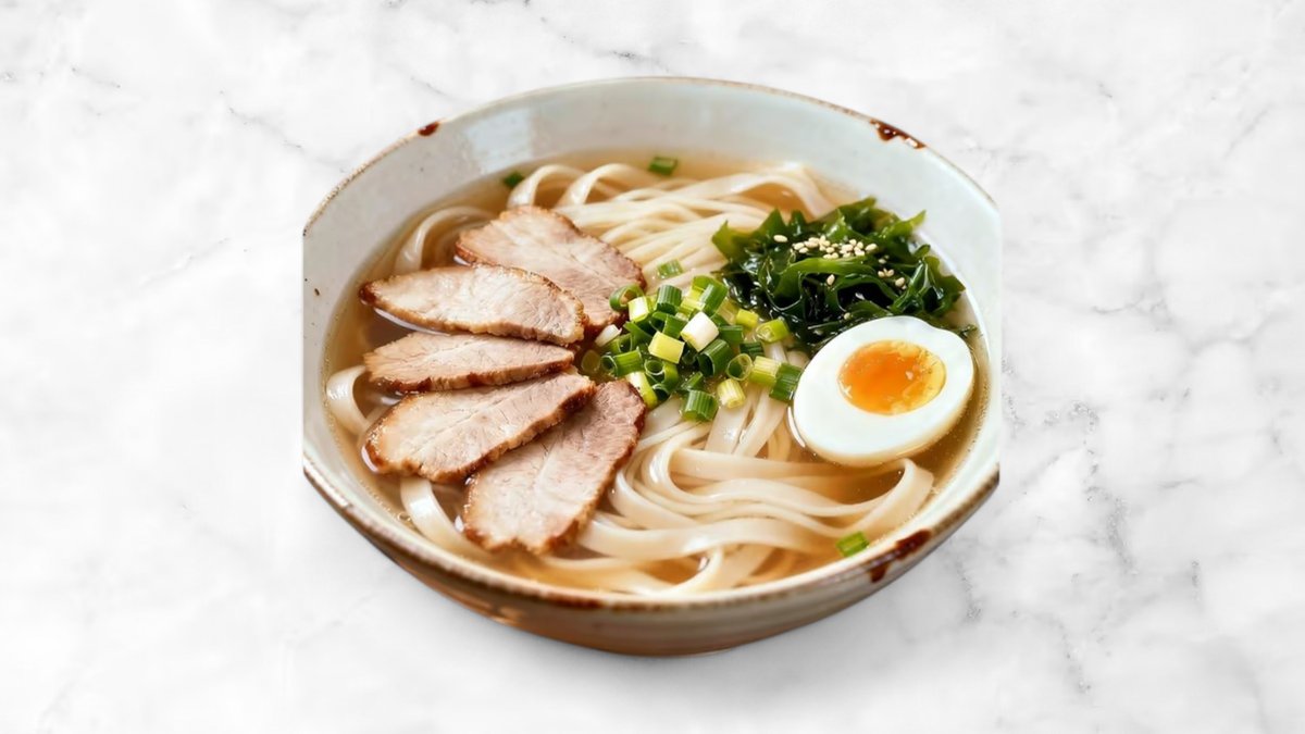 Risnudler med Shio suppe. Toppes med svinekødsskiver og sæsonens grøntsager.