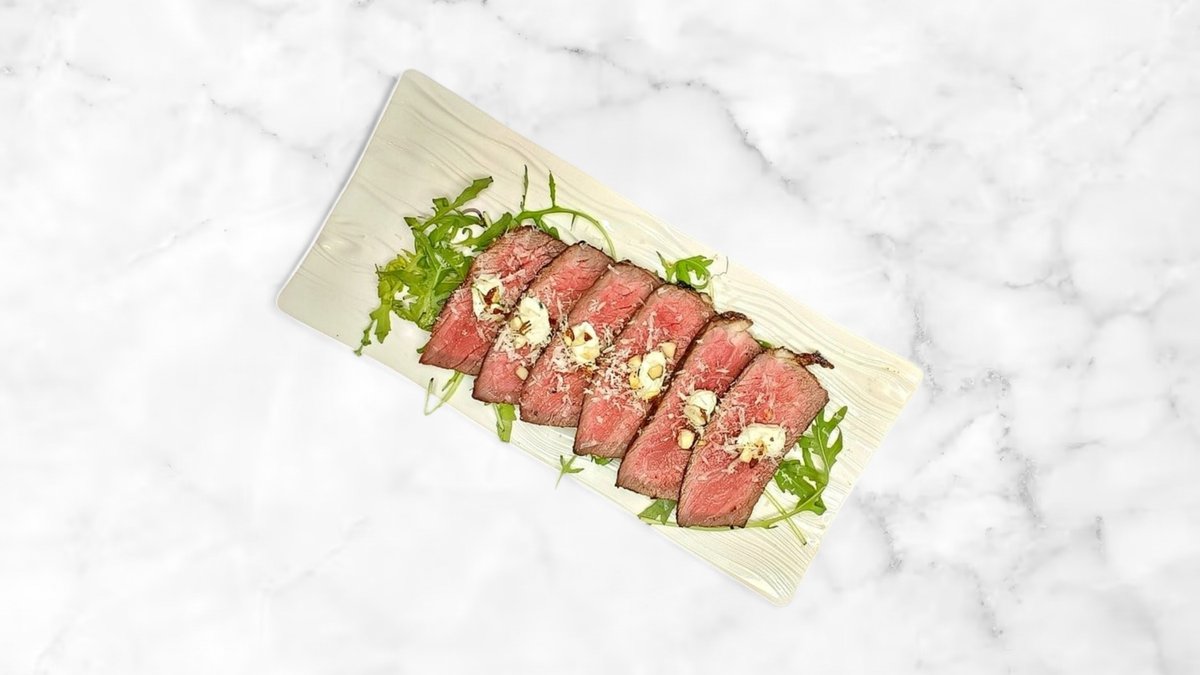 Letgrillet oksekød tataki i tynde skriver med urteost, parmesa og sprøde mandler.