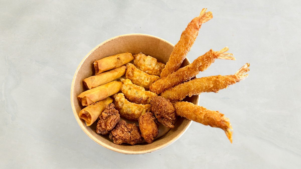 4 x Tempura Rejer 4 x Dybstegt Kylling 4 x Dumplinger 4 x Miniforårsruller Og én valgfri dyppelse.
