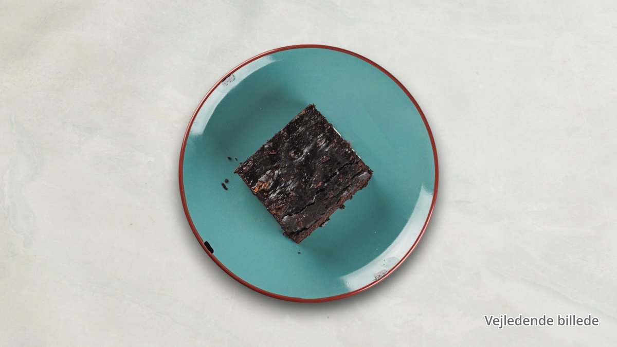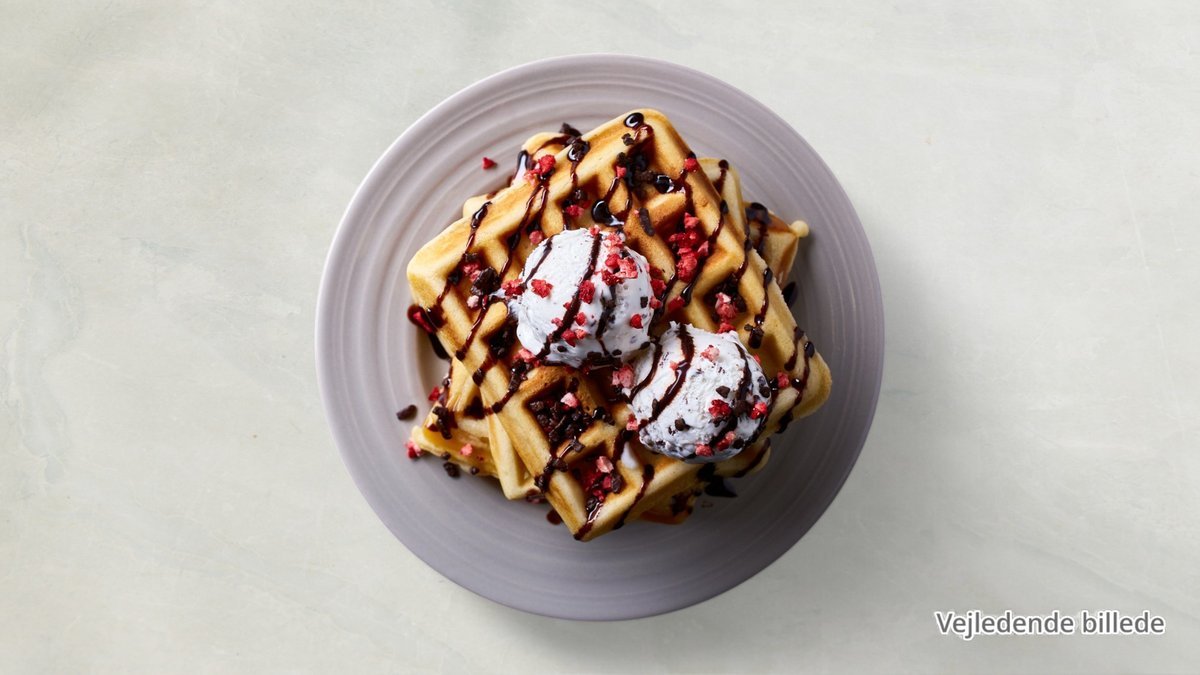 Serveres med chokoladesauce, tørrede hindbær og flødeskum.