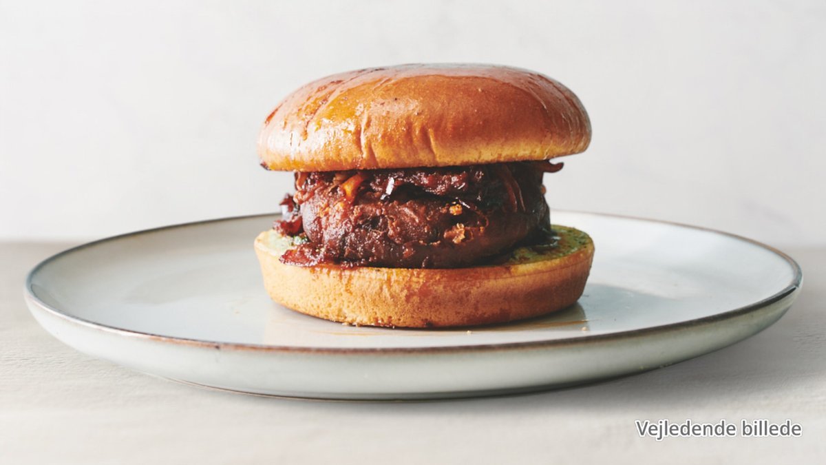 Vores burgere serveres med salat og mayo på brød, syltede agurker, syltet rødløg, fries og burgerdressing. V - vegetarisk