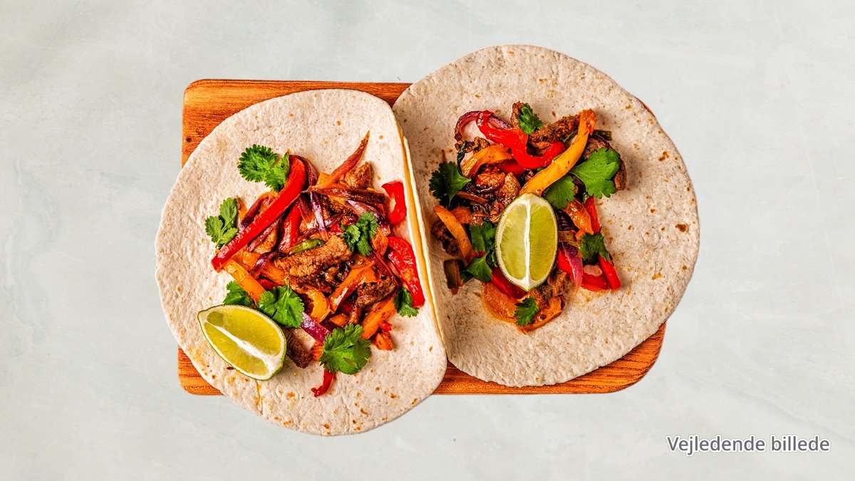 Fajitas med grøntsager, guacamole, salsa, cremefraiche og ost. Vælg mellem kylling eller oksemørbrad.