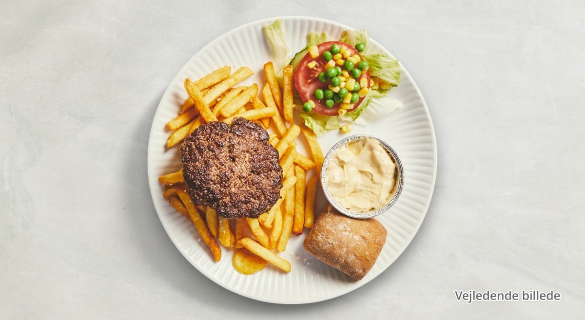 Hakkebøf, ketchup og mayo. Serveres med pommes fritter og remoulade.