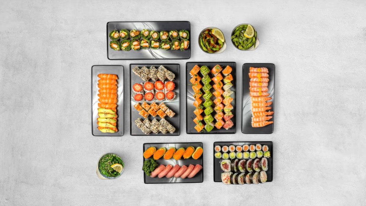 Nigiri: 6 x Laks 6 x Flamberet laks 6 x Laks m. avocado 6 x Tun 6 x Tigerreje Gunkan: 6 x gunkan laksrogn Rispapir: 8 x Rispapir kylling 8 x Rispapir crispy EBI Inside-out: 8 x Spicy tun 8 x Crispy EBI 8 x California 8 x Jordbær lady Toppede maki: 8 x Crispy rainbow 8 x Red dragon 8 x Tokyo roll 8 x Fly chicken Store maki: 6 x California 6 x Spicy tun Små maki: 8 x Laks 8 x Avocado Serveres med tangsalat, spicy edamame og edamame.