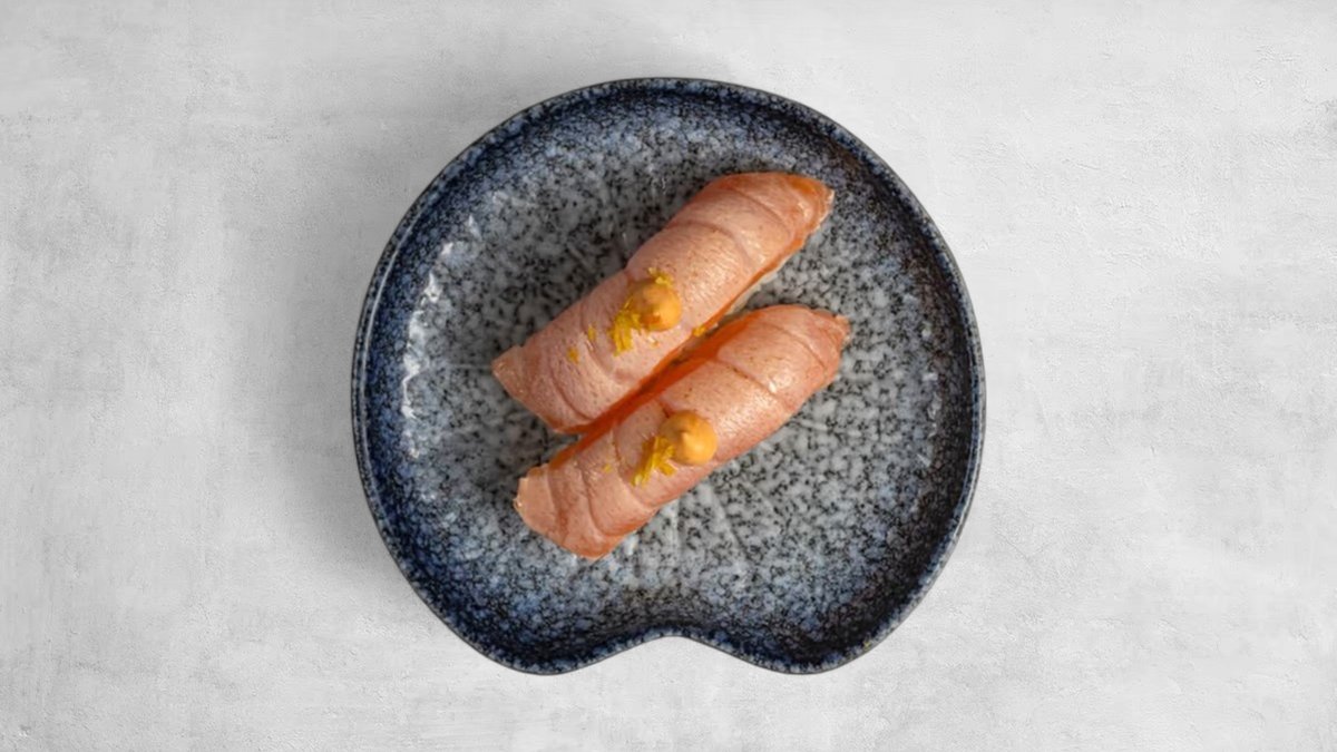 Sprøde krebsehaler, avocado og agurk. Toppet med lynflamberet laks, chilimayo og katafi.