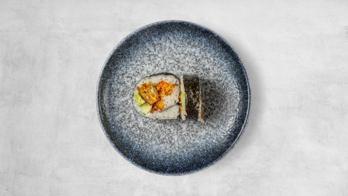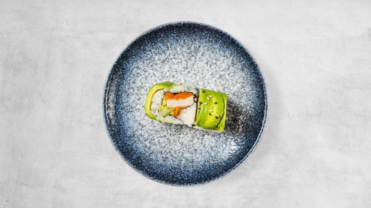 Avocado, agurk, rucola og japansk mayo. Toppet med avocado og chili sesam.