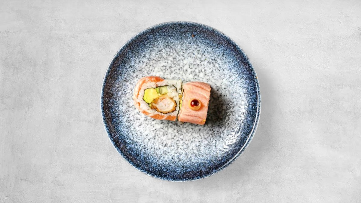 Surimi, agurk og avocado. Toppet med laks, forårsløg og lakserogn.