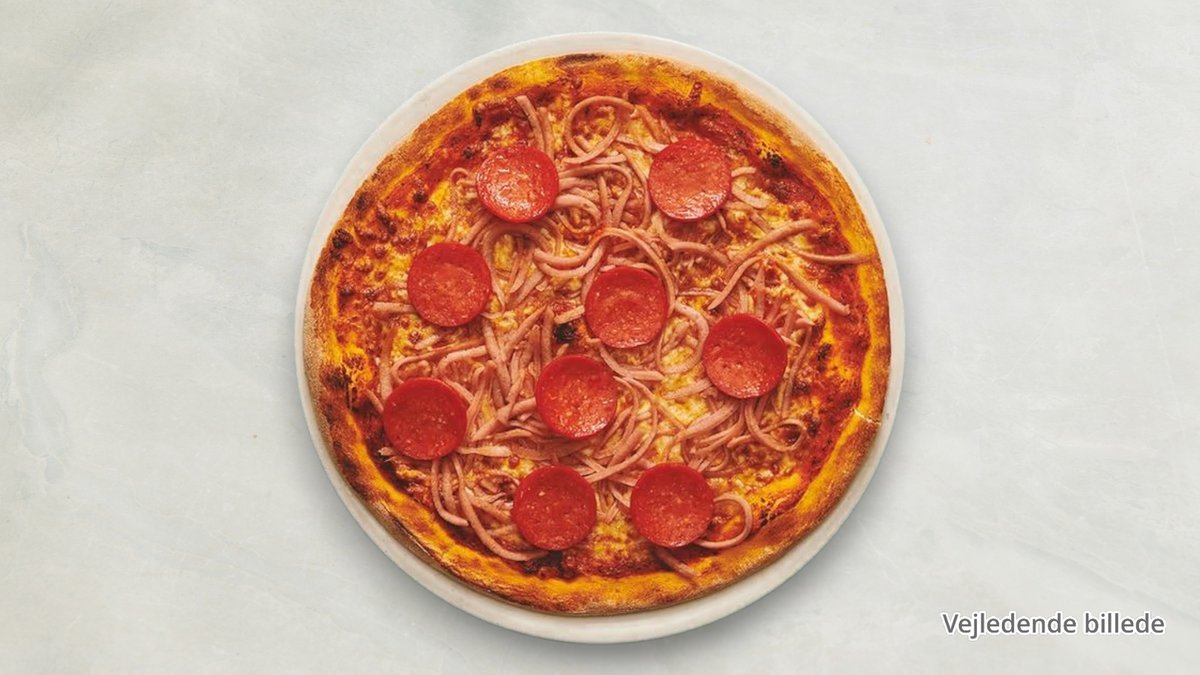Tomatsauce, ost, skinke, kebab og pepperoni.
