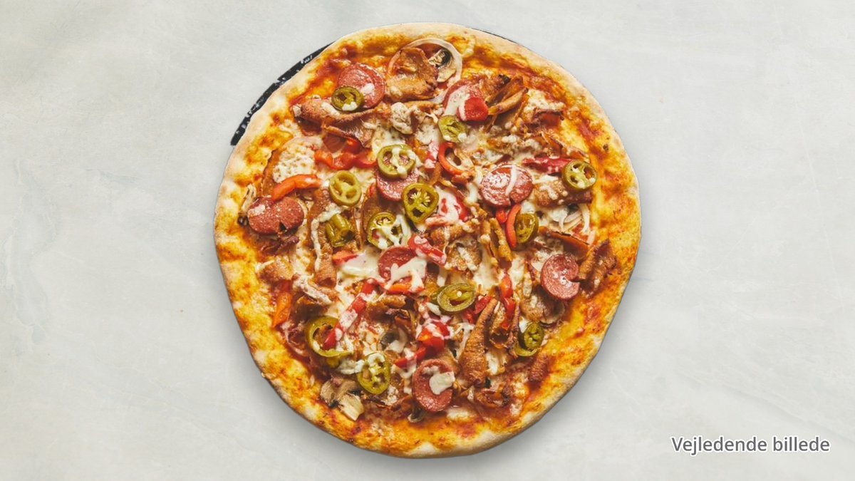 Tomatsauce, ost, skinke, pepperoni, kebab og jalapeños.