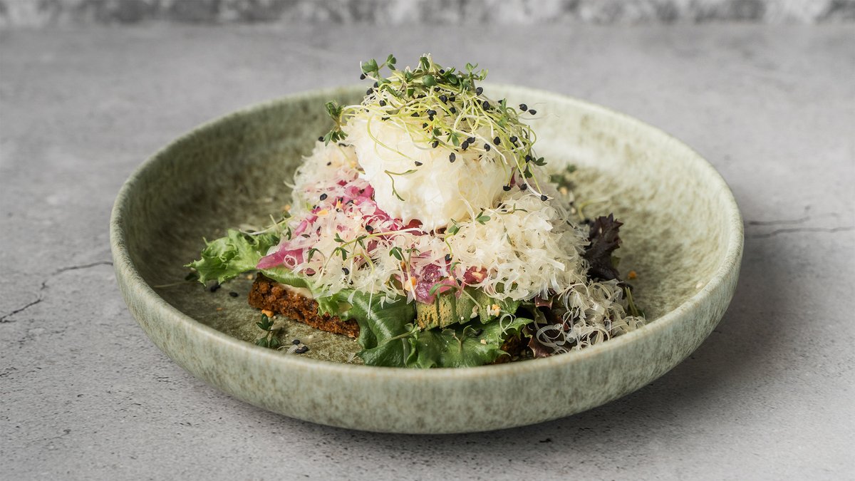 Avocado, pocheret æg, syltede rødløg, everything bagel seasoning og vesterhavsost på rugbrød.