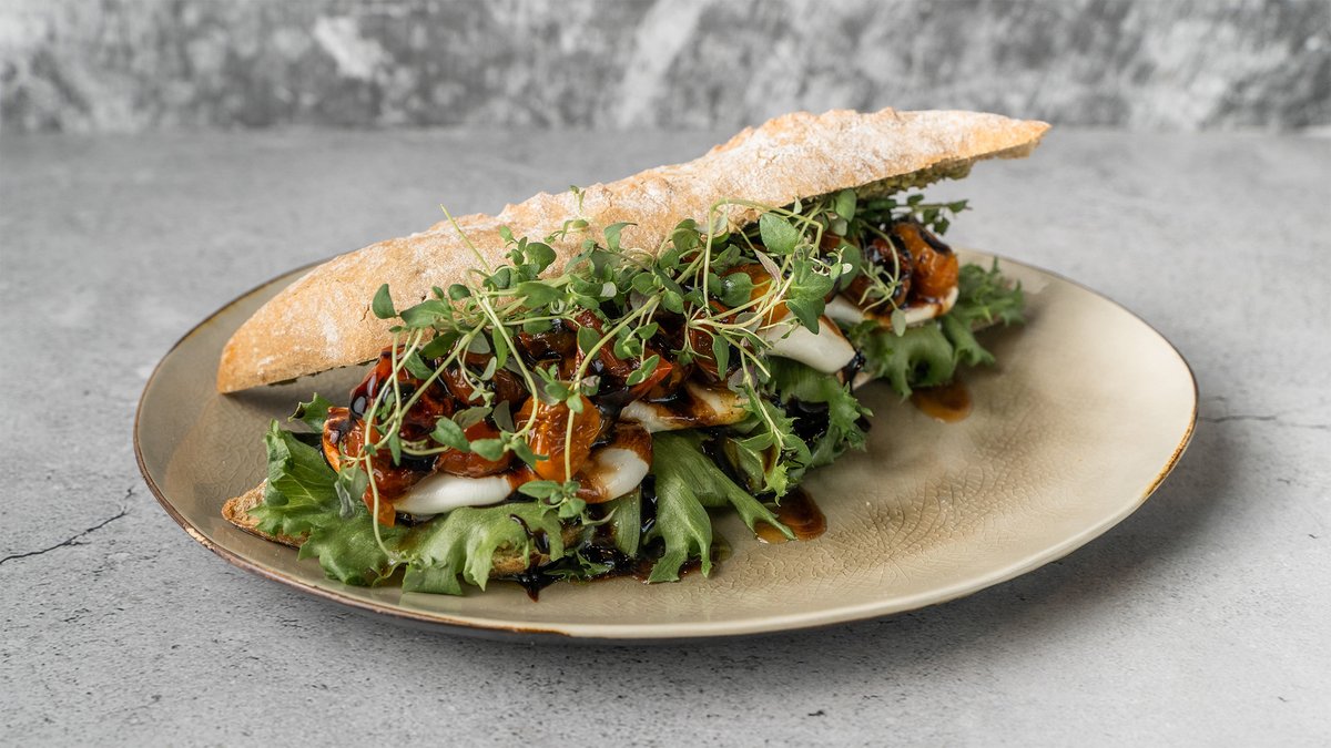 Brød med fyld af karamelliserede tomater, mozzarella, balsamico glaze og basilikumspesto,