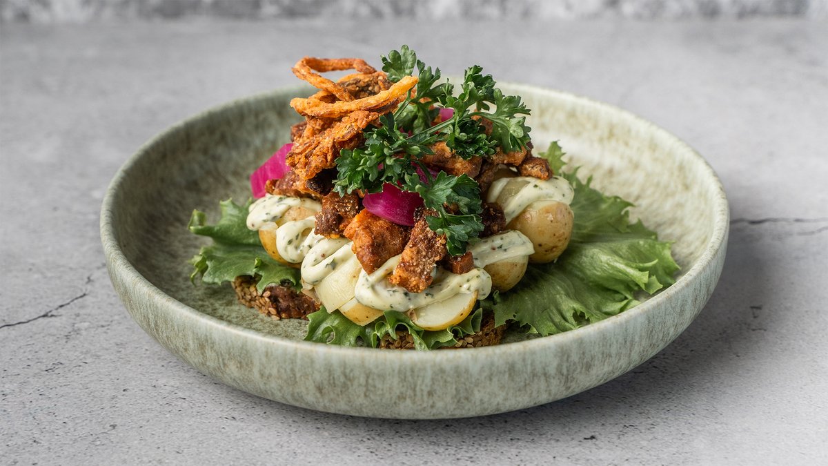 Kartofler, stegt flæsk, sprøde løg og persillemayo på rugbrød.