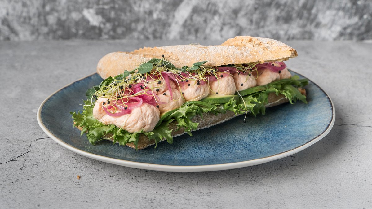 Brød med fyld af laksemousse, avocado, syltede rødløg, salat, tomat og aioli.