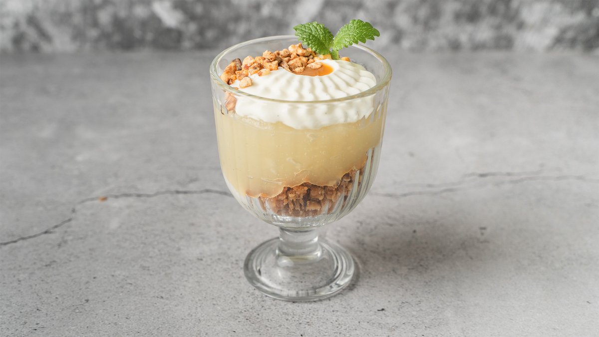 Lag af æblemos, vaniljecreme, karamel og hjemmelavet crumble.