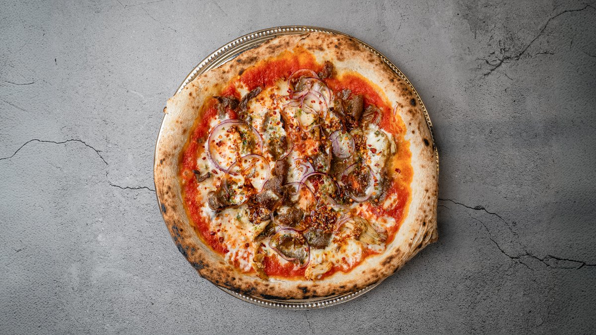 Mozzarella, stracciatella, soyamarineret oksefilet, rødløg, peberfrugt, sesamfrø, hvidløgsmarinerede svampe, pecorino ost og soya chili