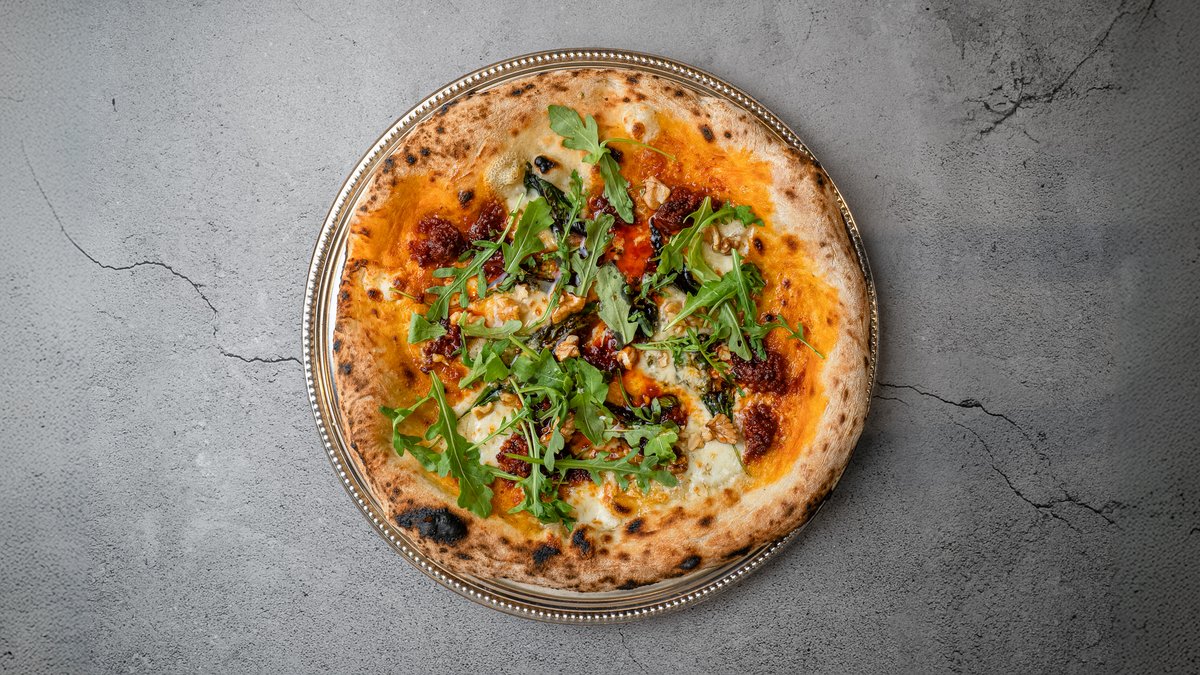 Mozzarella, blå ost, N'Duja, valnødder, honning, basilikum og rucola