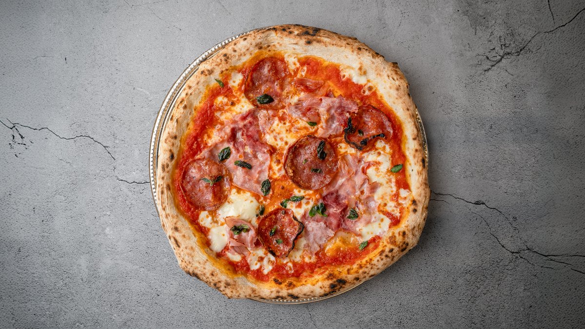 Tomatsauce, mozzarella, smashed meatballs, trøffelsalami, lufttøret svinekæbe og chili
