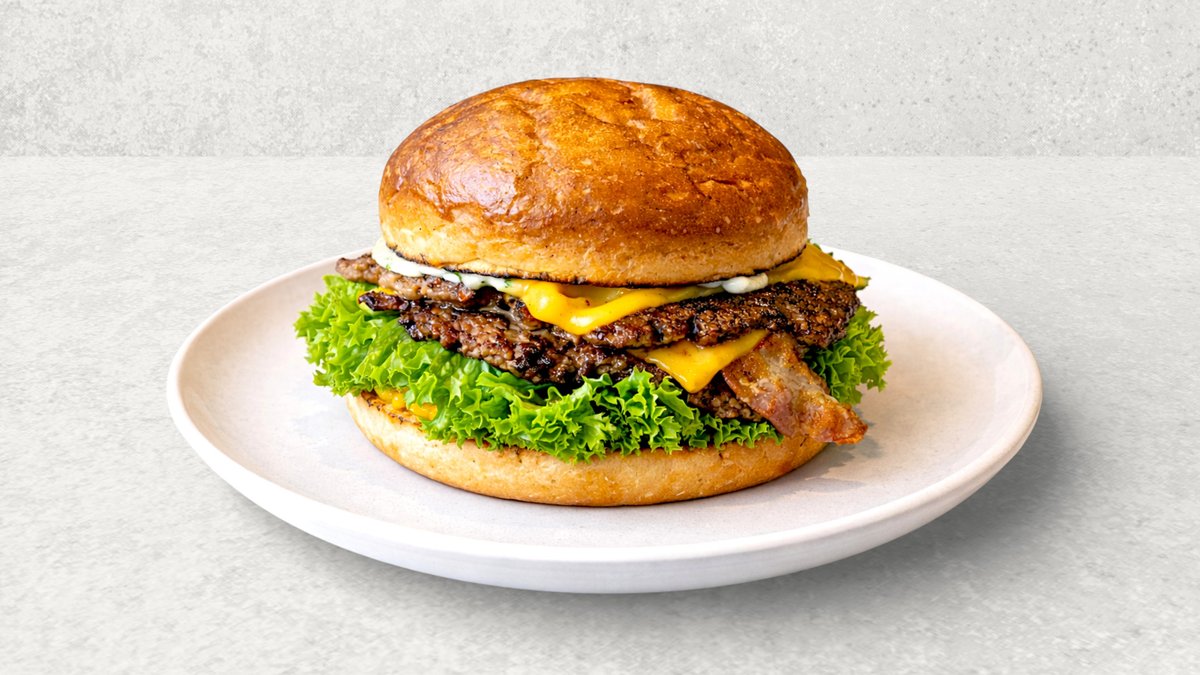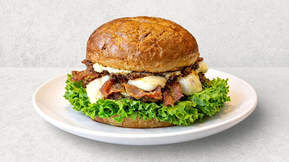 Burgerbolle med fyld af oksebøf, cheddar, bacon mayo, sennep, ketchup, bacon- & løgmarmelade, stegt bacon, rå løg, salat og pickles.