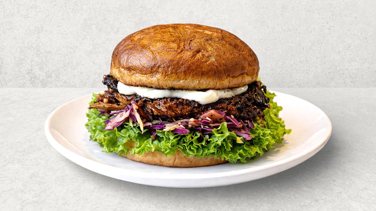 Burgerbolle med fyld af BBQ-røget kyllingeoverlår, smash house mayo, ketchup og kålsalat med sesam.