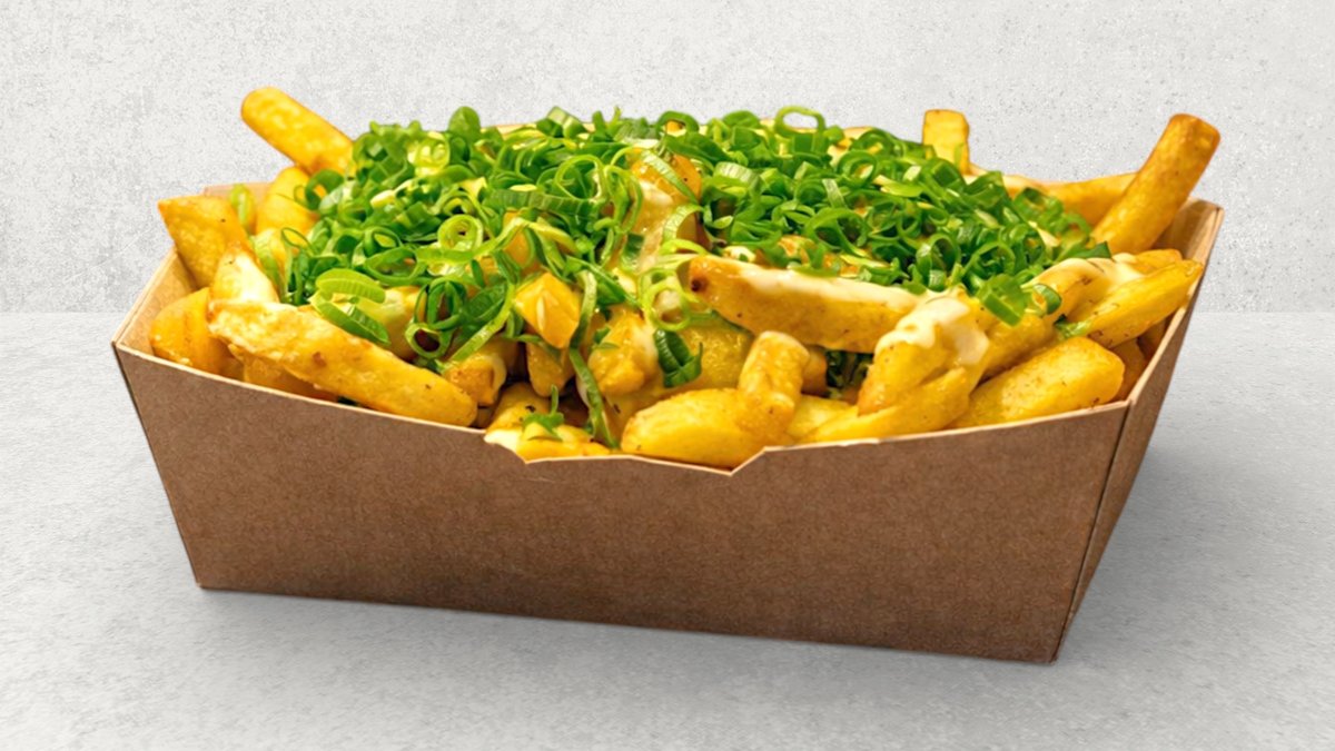 Pommes frites toppet med Milos hemmelige ostesovs.
