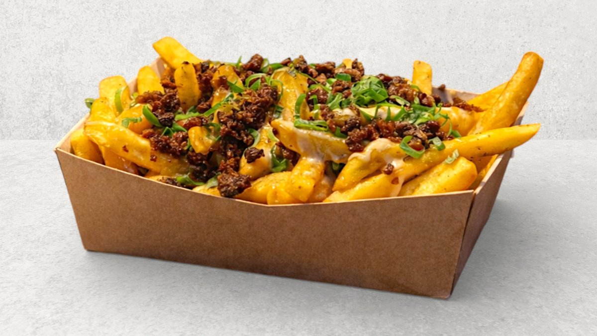 Pommes frites toppet med Milos hemmelige ostesovs og stegt bacon.