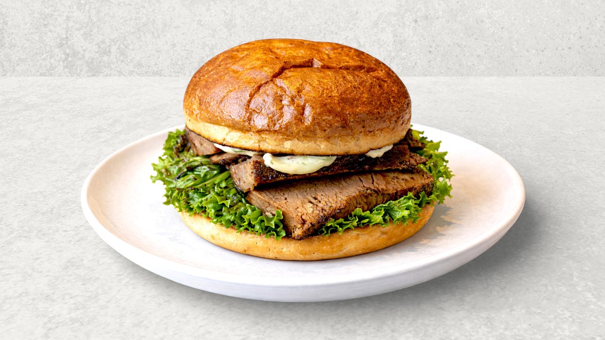 Burgerbolle med fyld af varmrøget oksespidsbryst, pickles, smash house mayo, salat, rå løg og sennep.