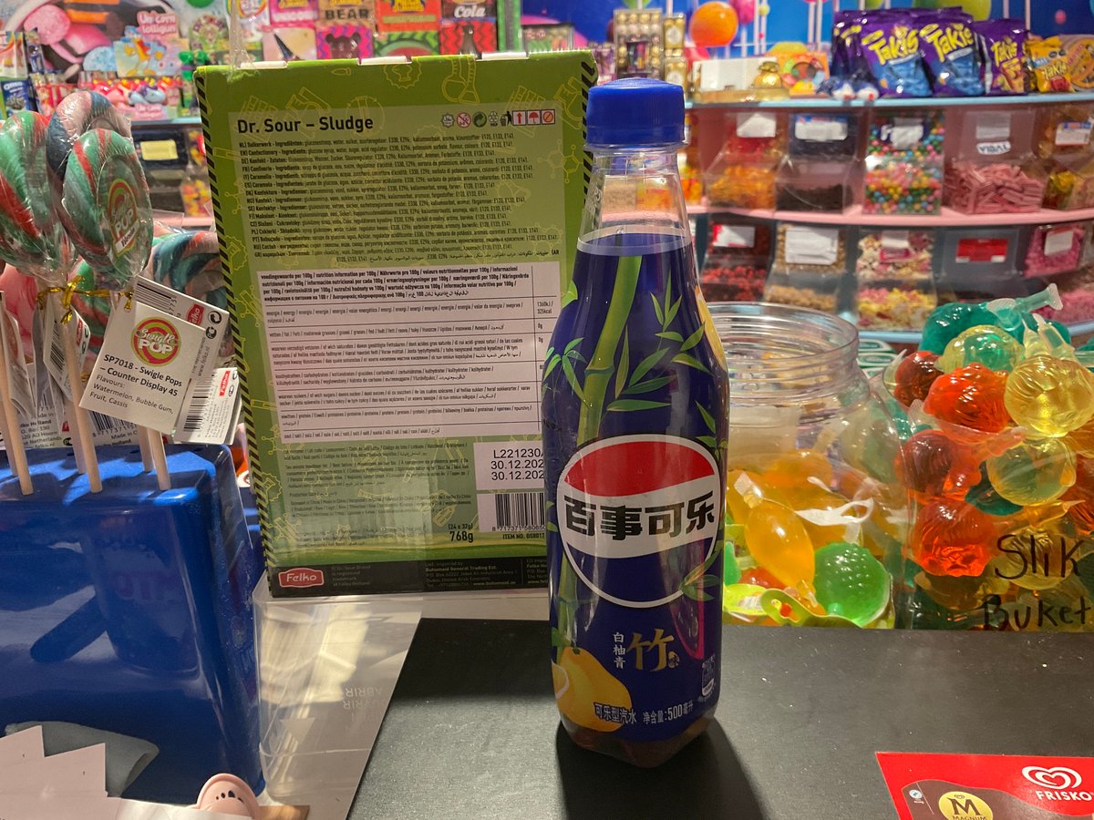 En masse lækre søde sager og bredt udvalg af slik, snacks og drikkevarer.