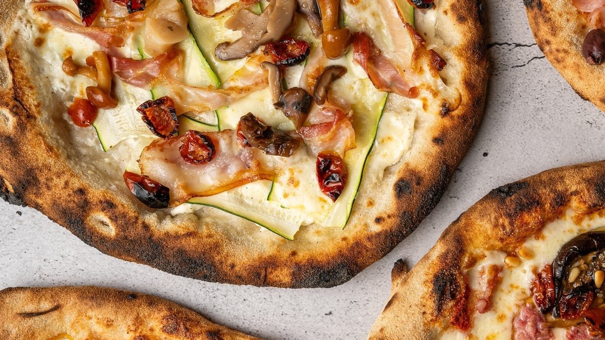 Tomatsauce, mozzarellaost, serranoskinke, champignon, tomatskiver og grøn pesto.