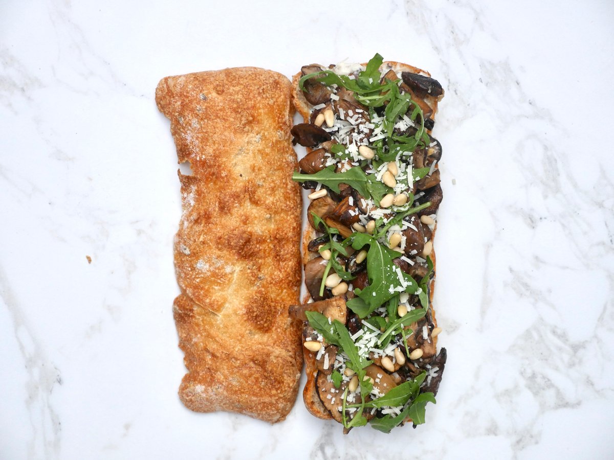 Øko ciabatta med fyld af økologiske svampe (portobello, brune og shiitake), smør, hjemmelavet trøffeltapenade, creme fraiche, parmesan, pinjekerner og rucola.