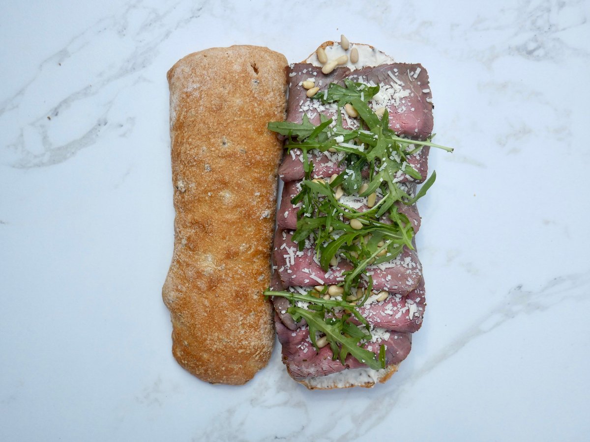 Øko ciabatta med fyld af økologisk hjmemmelavet roastbeef, hjemmelavet trøffelmayo, parmesan, pinjekerner, og rucola.