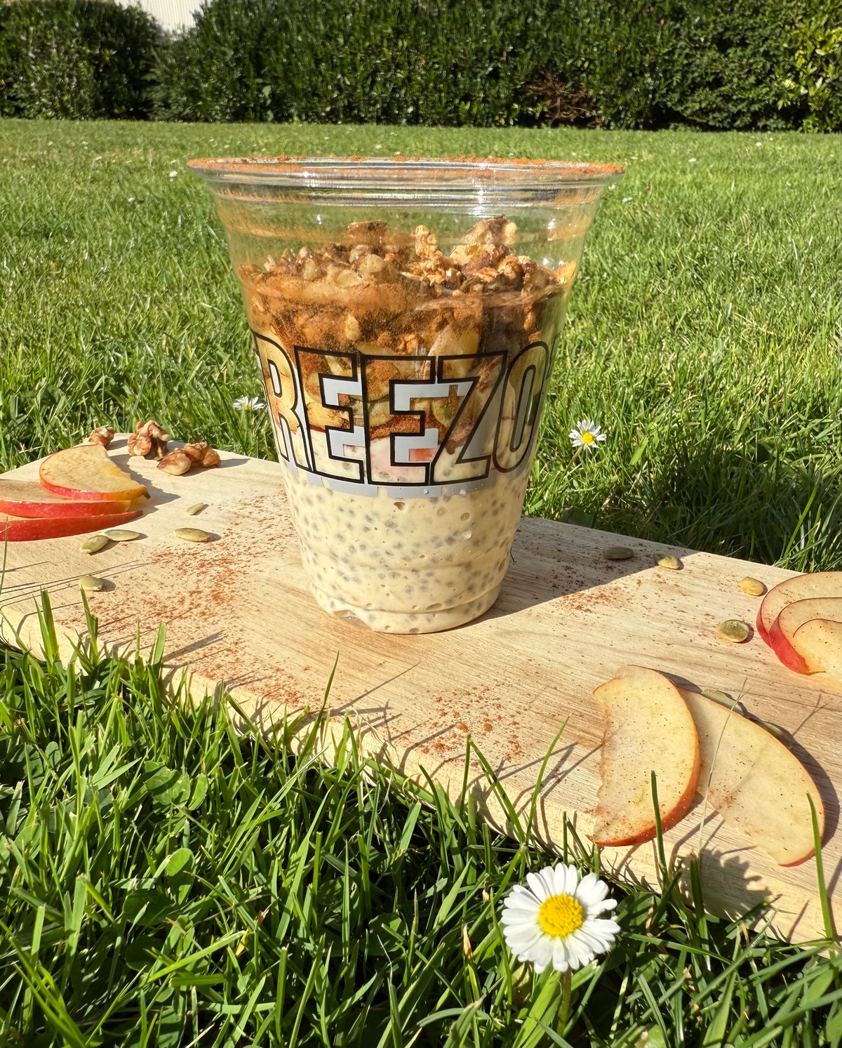 Øko Overnight oats med øko havre, chiafrø, havremælk, yoghurt, vaniljesirup, æble, kanel, granola og honning.